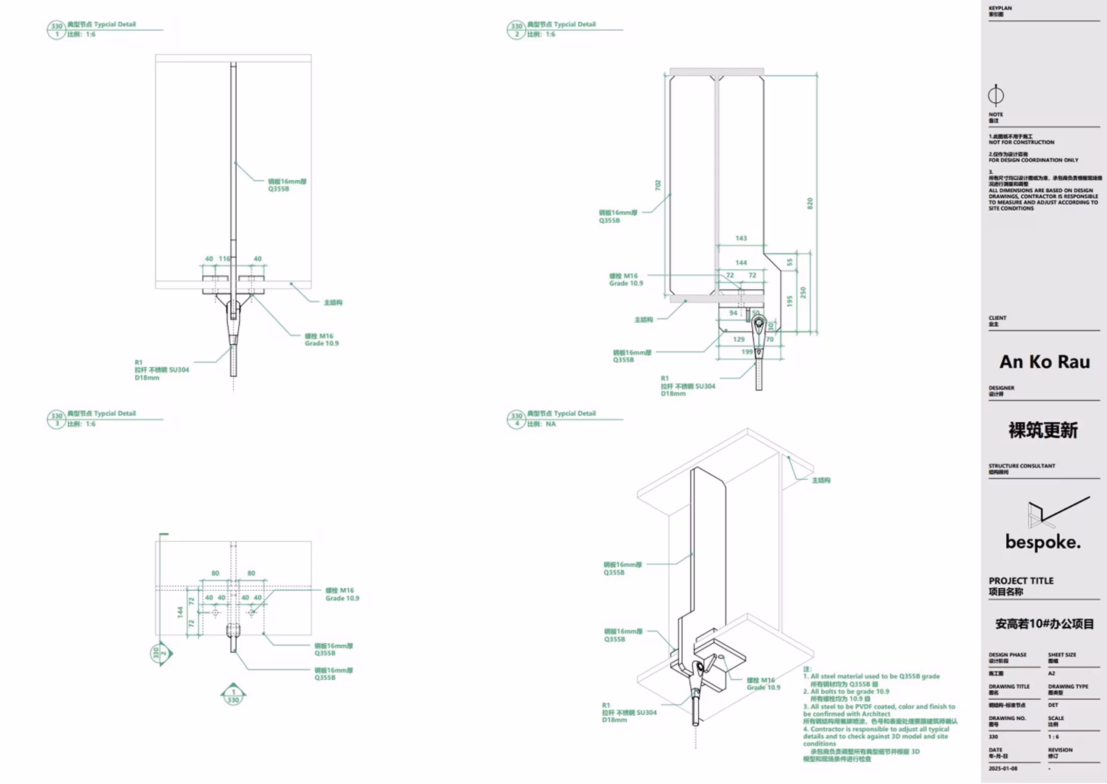 Ankorau LABO Center project presents a collection of structure details that are the key aspect of the project. Through our model and drawing package organization, a complete workflow has been setup using all the power of Rhino to implement a full 3D model at fabrication level, with associated 2D drawings at minimu efforts, both in Rhino and AutoCAD.