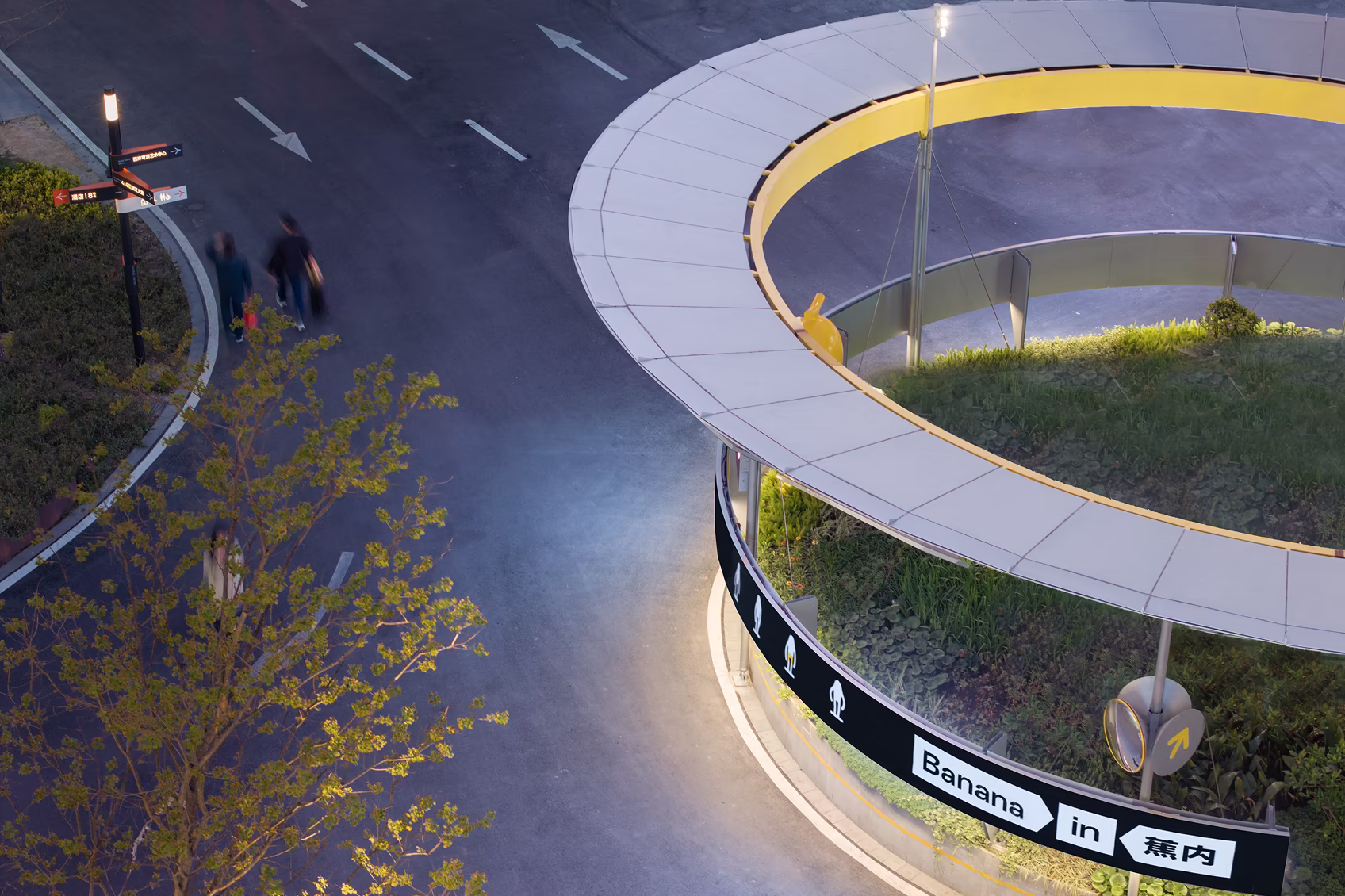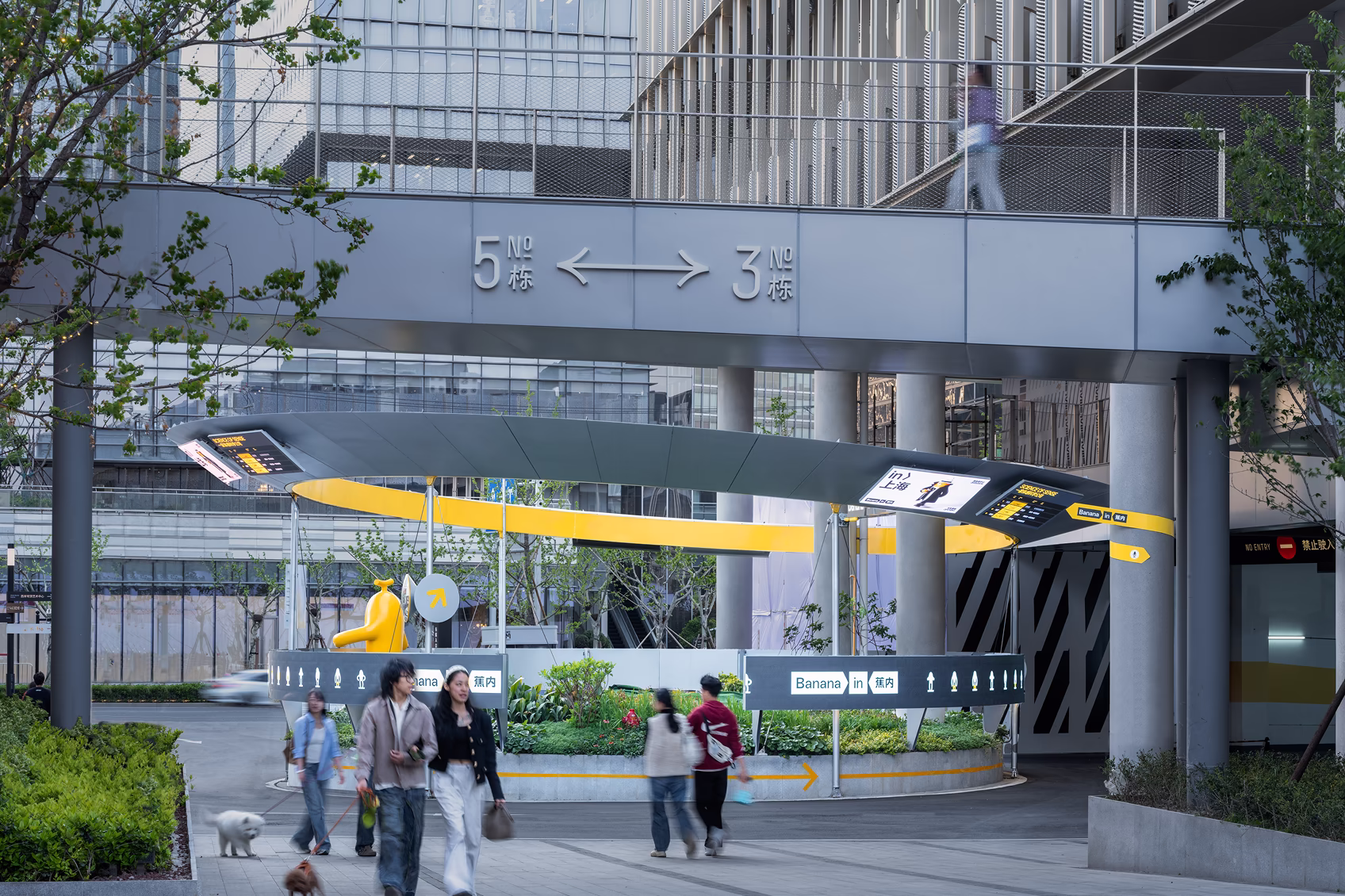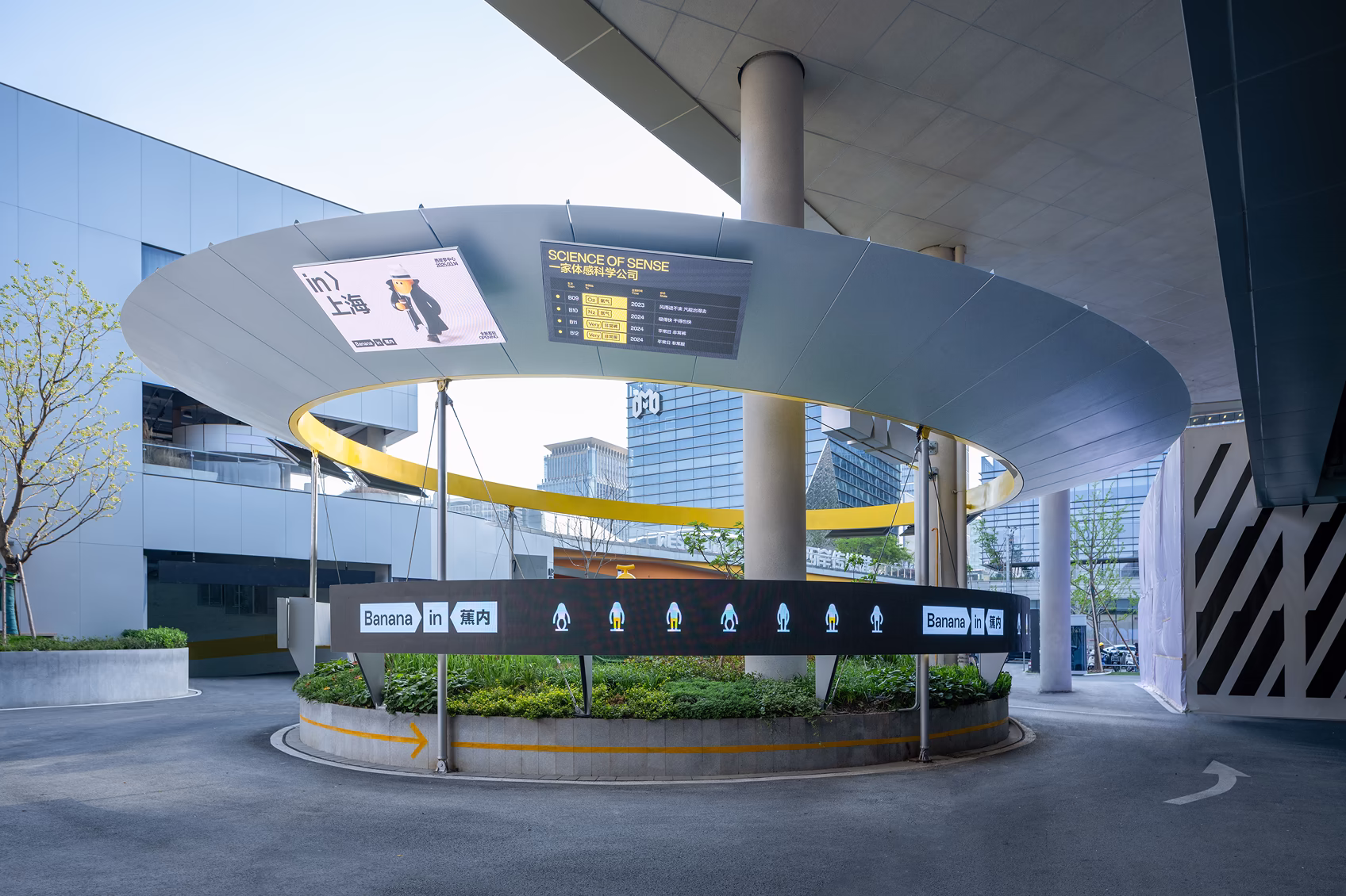 bespoke. has once again collaborated with RoarcRenew to create an inspiring and innovative space in West Bund, redefining the entrance of Bananain’s brand space — The circular driveway has been transformed into a covered public station structure, the LED screen structure wraps around the entire building, and a series of cables has been pulled between the main columns to suspend Bananain’s branded signage boxes.