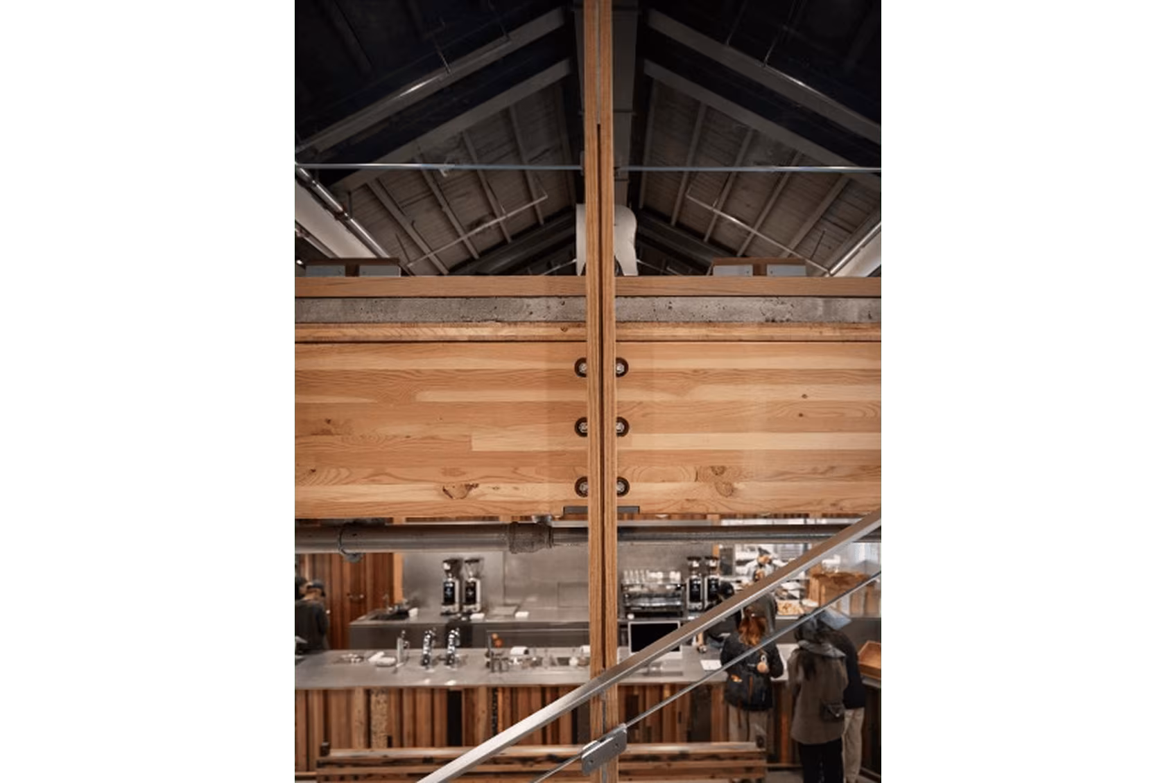 The entire second floor is a newly added Suspended platform, which is also the most challenging part of this building renovation. Unlike traditional support, it features a hanging structure achieved through the tension of tie rods, giving the space a fascinating sense of floating. This design element resonates with the recycled materials from old ships, adding a unique, dynamic quality to the space.
