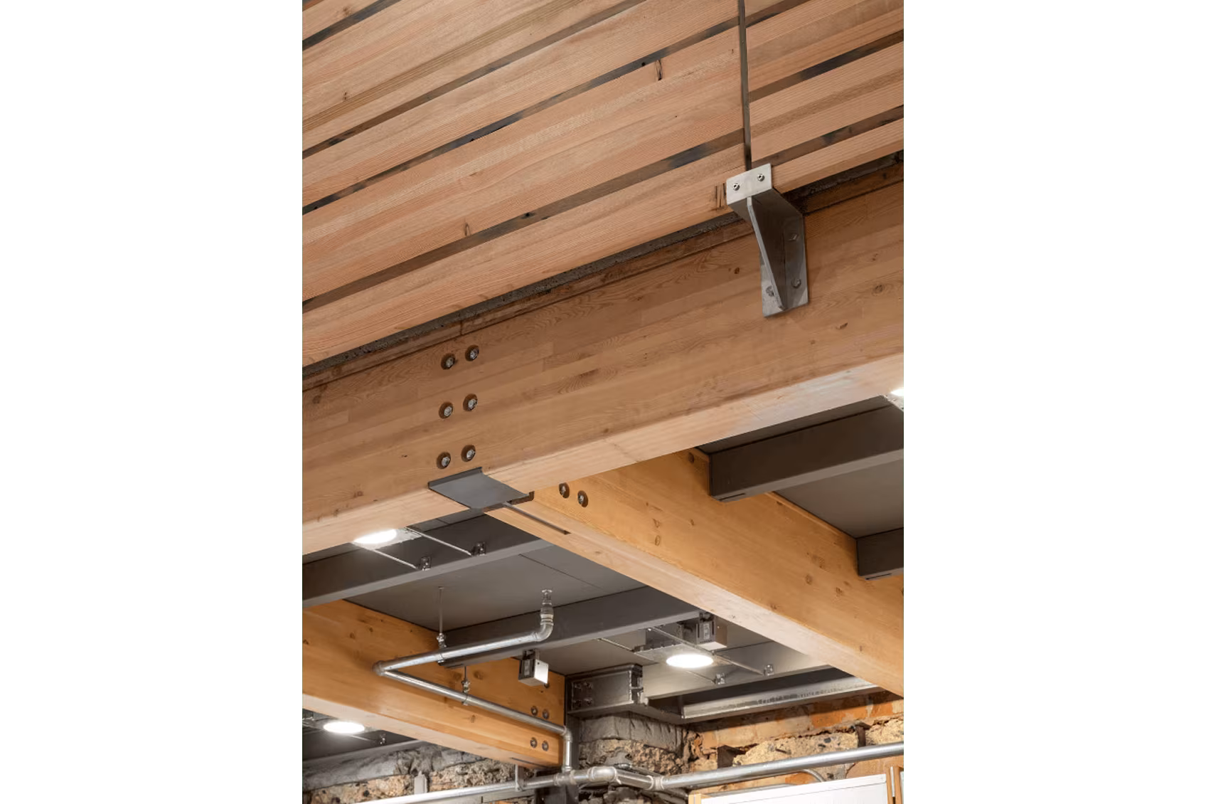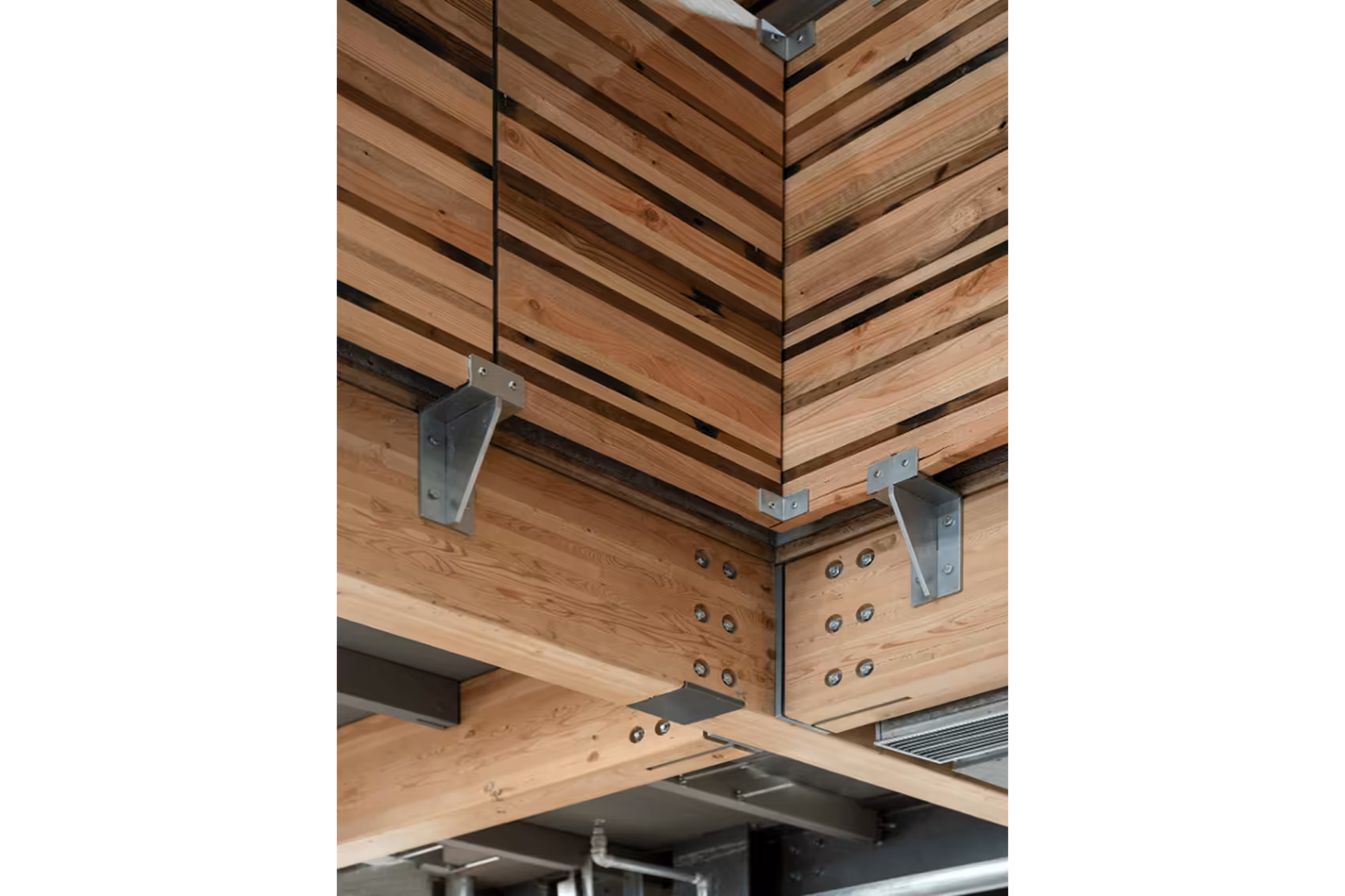 The new added structure is mainly made of Glued Laminated Timber (GLULAM) using Douglas Fire species which enables achieving a TCT32 grade. The timber connections that link the different elements together are using Steel Q355B and the Tension Rods are made of Stainless Steel SU304.